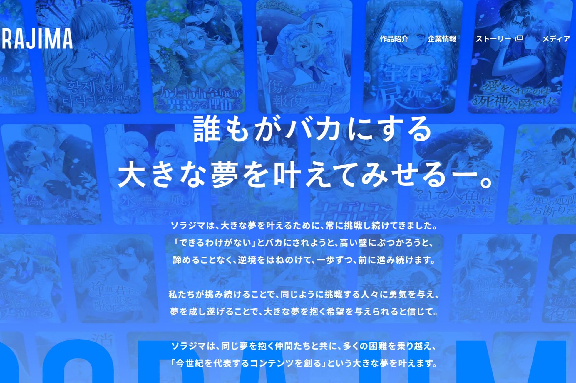 ▶︎ソラジマのカルチャー 壮大なミッションを果たすために、ソラジマは3つのカルチャーを大切にし、強みにしています。そして、このカルチャーが存在するからこそ、メンバーは日々、刺激的で自由度の高い仕事にワクワク取り組むことができます。 Be a Pro:周りに刺激を与えるほどに成果に貪欲か Why No Feedback?:言いにくいことほど率直に伝えられているか Freedom & Responsibility:他に承認を求めず、自らが意思決定者であるか これら3つのカルチャーは、ソラジマメンバーの羅針盤であり、壮大なミッションへの道を照らします。ソラジマとメンバーにとって、これらのカルチャーは世界を獲得する強力な武器です。 https://story.sorajima.jp/articles/ft0dkec5we ▶︎チームで連載Webtoonを制作 フルカラーのWebtoon作品は、編集者、企画作家、ネーム、線画、着彩、仕上げと10人程度のチームで一つの作品を作り上げます。物語の魅力を引き出すためにそれぞれのポジションのプロ達が腕を振るいます。チームでの制作になるので、連載のクオリティが保てるように納期やフォーマットの調整をしながら作品の制作を進めていきます。 ▶︎ ソラジマの環境と可能性 成長したい、成果を出したいという強い気持ちがあれば人の「可能性」は無限大だということを知ってもらいたい。 自分の可能性を広げたいと考えているあなたにはぴったりの会社だと胸をはって言えます。 ソラジマには、大学生や留学生、元テレビマンや総合商社出身、総合広告代理店出身といったWebtoon経験のない方も多くいます。 未経験の方でも輝ける職場となれるのは「意慾・プロ意識の高いメンバーが集まっている」「互いにフィードバックを求める自走力」があるからです。 本当はやってみたかったけどあきらめてしまった人もソラジマでなら自分の可能性を生かせるチャンスをつかめるかもしれません。 ▶︎「誰もがバカにする、大きな夢を叶えてみせるー。あなたもこの壮大な夢に、ジョインしませんか?」 今世紀を代表するコンテンツを創ることに本気で愚直に向き合うチームがソラジマです! 30年以上かかるであろう果てなき道のりを、ソラジマに関わるみなさんと一緒に楽しく登っていきたいと思います。 誰もがバカにする大きな夢をソラジマで叶えましょう!