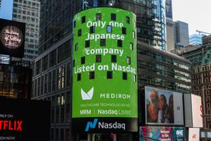 NYのタイムズスクエアにあるNasdaq本社にて行われたベルセレモニーの写真。現在、米国Nasdaq上場を果たしている日本企業になります。