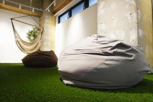 芝生エリアやクッションがあり、好きな場所で業務ができる