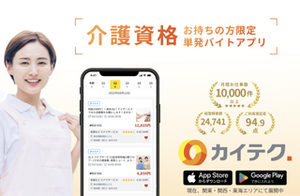 ▼事業内容 私たちは、介護・看護職の方々がすき間時間を活用して単発バイトができる、介護&看護ワークシェアリング「カイテク」を運営しています。 「カイテク」は「介護/看護資格証の認証⇒仕事探し⇒勤務⇒評価⇒給与受取」(特許出願済)までを、Web上の簡単な操作で完結できるのサービスです。 「カイテク」では、これまで介護・医療業界では成し遂げられなかった「オンデマンド勤務(すぐにクイックに働く)」を実現することが可能です。 オンデマンド勤務による「時間や生活に縛られず自由な働き方」を介護業界全体に推進することで、以下の3点を実現しています。 1. 有資格者の空き時間の有効活用(収入UP/経験蓄積)ができ「副業層」の促進 2. 定時勤務や正社員としては働くことのできなかった「潜在介護士」が仕事に携わり「潜在時間/スキル」の掘り起こしができ、日本全体の介護労働力を増加 3. 「お試し勤務」ができるため、介護職と介護事業所のミスマッチを防止し離職率を低下 私たちは「テクノロジーで介護医療現場の笑顔を1つでも増やす」というMissionを掲げ、エッセンシャルワーカーである介護・医療職の方々が笑顔になれるか?を軸に本サービスの成長に向けて尽力しています。 ▼実績 登録エッセンシャルワーカー数3万人以上 登録事業所数:2,500件以上 前年同月比(直近):600%以上 を達成しており、順調に規模を拡大しております。 ▼受賞歴 「カイテク」は、「総務大臣賞 受賞」「経済産業省主催 ジャパンヘルスケアコンテスト 最優秀賞 受賞」はじめ、各界からご評価いただいています。 今後も、介護医療職の方々の多様な働き方を実現できるよう、行政の協力を得て全国への展開を進める予定です。 [受賞歴一覧] ・経済産業省主催 ジャパンヘルスケアコンテスト 最優秀賞 受賞  (https://prtimes.jp/main/html/rd/p/000000011.000043426.html) ・総務省主催 起業家万博 総務大臣賞 受賞  (https://www.nict.go.jp/venture/2020_banpaku_hyosho2.html) ・令和3年度浜松市ファンドサポート事業採択  (https://prtimes.jp/main/html/rd/p/000000181.000049248.html) ・いちはら未来想像プロジェクト採択  (https://ichimira.jp/entry/details)