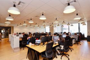 開放感がるMTGスペース。10〜13Fに様々な形式の会議スペースやワークスペースがあり状況に合わせて使い分けをしています。昼食や休憩をができる共有ラウンジもありコーヒーから食後のビールまで無料で提供されています。