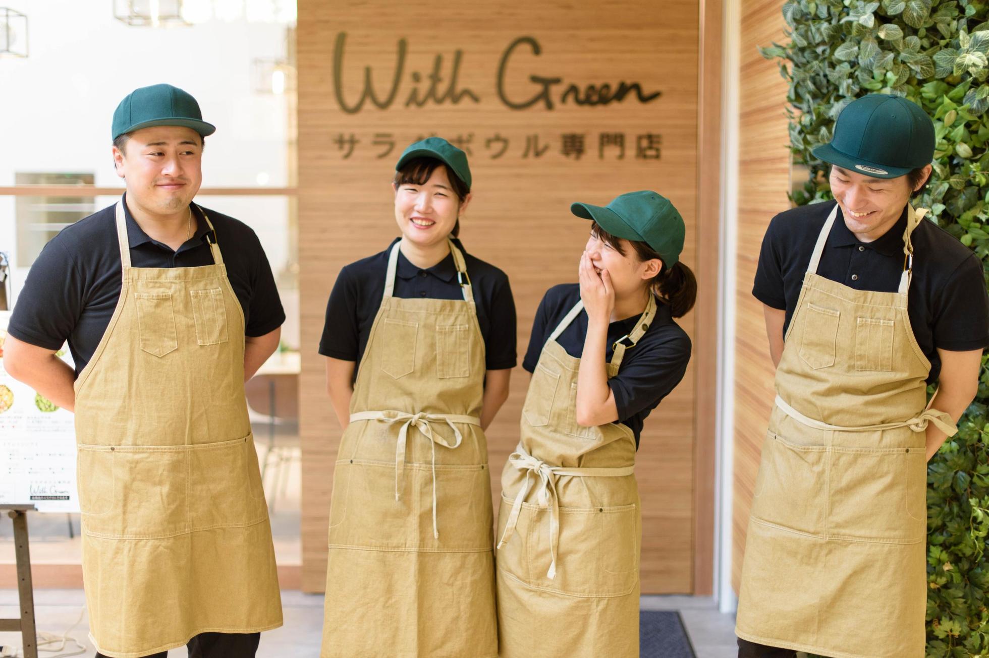 <私たちが一緒に働くパートナーに求めること> 現在社員は40名を超え、アルバイトのパートナーを含めると300名以上が働いています。 採用する上で最も大事にしていることは『真摯さ』です。 そのため、真面目に仕事を頑張る従業員が多い職場だと思います。 <働く環境> 飲食店で働くにあたり、「長時間労働では?」や「休みが取れないのでは?」などを気にされる方は多いと思います。私たちは、そのような飲食店のブラックなイメージを変えていきたいという想いも強く、社員が働きやすい環境を整えていきたいと思っています。 基本的に月間8日は休日を取ってもらっていますし、残業も時期によってですがそれほど多くありません。また、店舗にもよりますが、店舗の営業時間は基本11時-21時のため、深夜まで働くということも少ないです。 <今後について> 創業から7年を超え創業期から拡大期に入ったところです。 ここまで大切に育んできた私たちのこだわりを、今後はブランドという形で多くのお客様に知っていただくフェーズに入りました。とはいえ、ベンチャー企業である私たちは、日々様々なトライをし、そこから数多くのラーニングをしています。 私たちはチェーン店ですが、一つ一つの店舗がそれぞれの個性を持った個店として地域に根差していくことも同時にかなえていきたいと思っています。WithGreenというブランドを広めていくことに情熱を持ち、仲間とともにチャレンジできる方を探しています。毎年8~10店舗のペースで出店をしていきますので、リーダーとして成長していきたいという方にはうってつけの環境です!