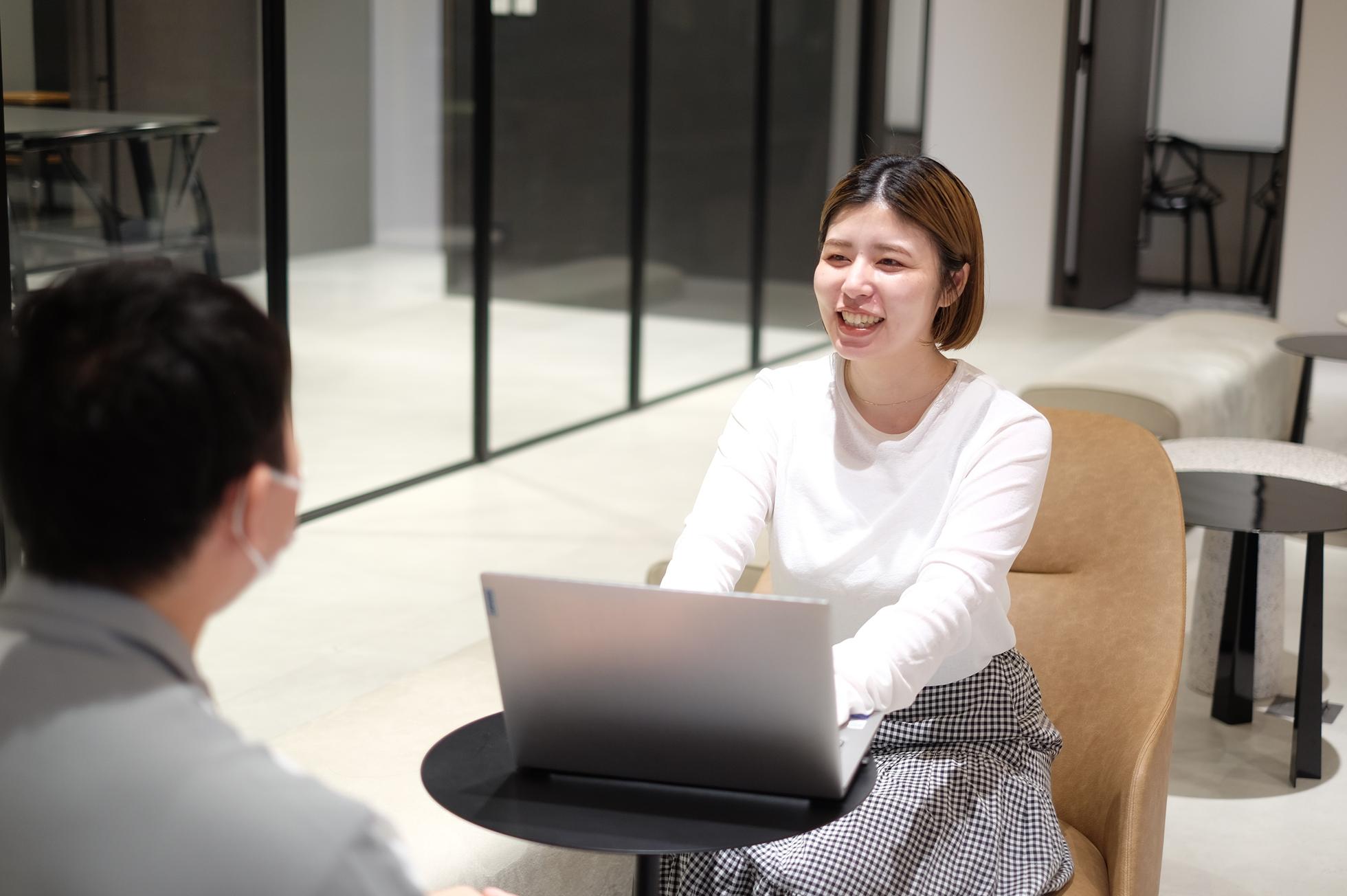 面談中に周りの雰囲気を共有します。ハイセンスなインテリアと設備を設えたオフィスをぜひ一度体験してください。