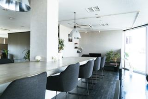 黒を基調とした会議室・開放的でオシャレな一階スペースでは勉強会や打ち合わせはもちろん、ゲーム大会やランチ会を開くことができます。
