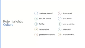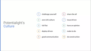 ポテンシャライトのCultureです。 当社は「Value」は理想の状態。「Culture」は今の状態として定義しています。この10つのCultureは2021年4月に全社的に共有しており、当時のメンバー全員でボトムアップ式で策定をしております。