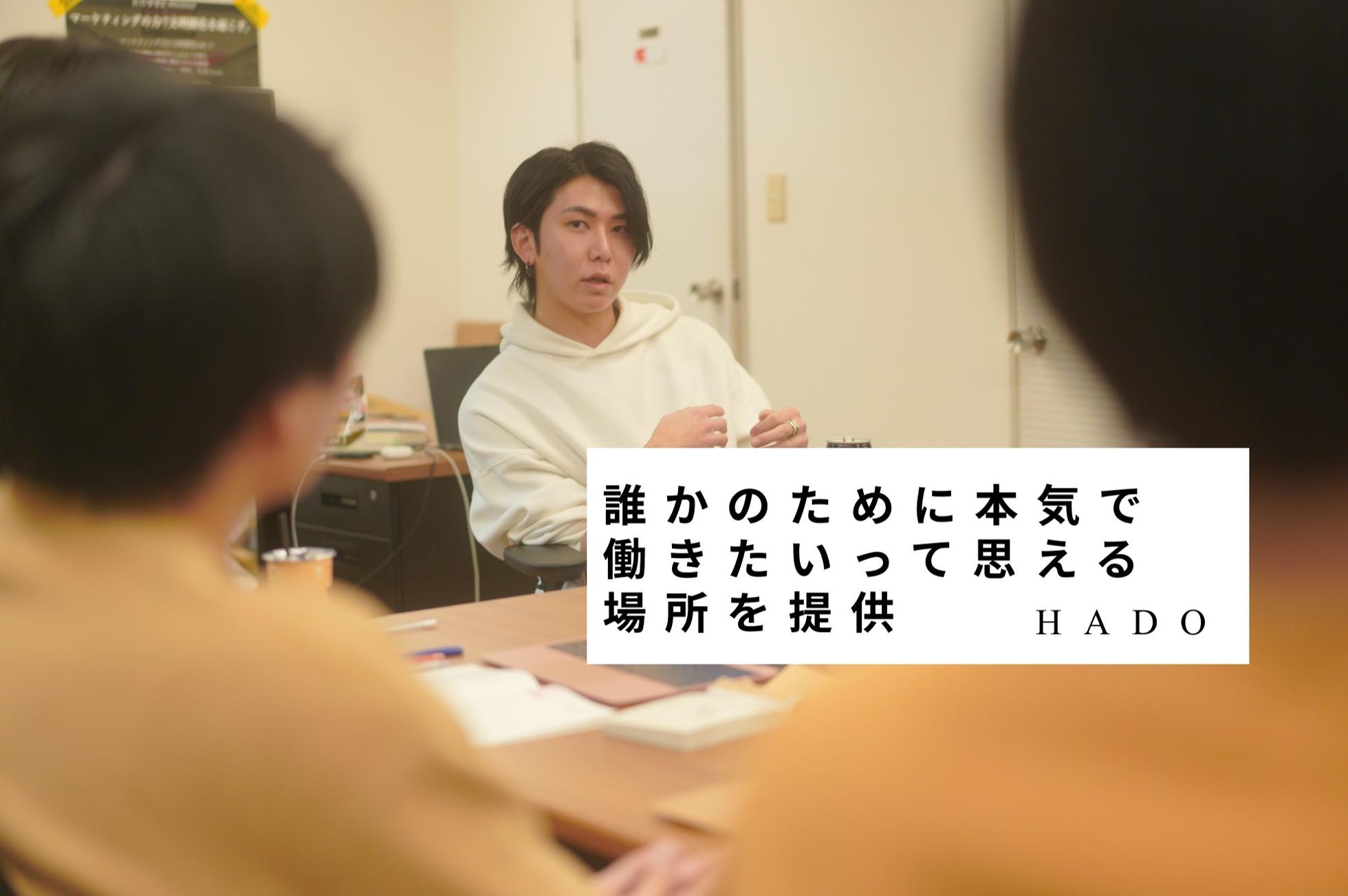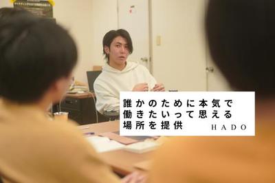 【創業背景】 創業者の田中が前職でサラリーマンとして働いている時、通勤電車でため息をつく大人が苦手でした。飲み会で仕事の愚痴を言う同僚が苦手でした。 どうせ働くなら、後ろ向きな気持ちで働きたくない。 今日のレベルアップを楽しんで、明日からの挑戦にワクワクして働きたい。 自分だけでなく、自分の周りの人たちがそんな前向きな気持ちで働ける場所を作りたい。 そんな想いからHADOを創業しました。 【自らと若者の人生のブレークスルーポイントに。】 新卒至上主義が根強く残る日本では、一度レールから外れてしまった方に対する風当たりは強いです。 創業者である田中も大学を中退していますが、学歴がないことで苦い思いをした経験がたくさんあります。 何らかの理由で会社を辞めてしまった、もしくは就職できなかった方は、確かに一度レールから外れてしまった“経歴に傷がある方”なのかもしれません。 しかし、だからこそ彼らには「次こそは失敗できない」「もう後がない」という焦りと強い覚悟があります。 私たちHADOは、私たちへの相談が彼らの人生のブレークスルーポイントになるように、一人一人の人生に本気で向き合って、日々業務に励んでいます。 【若手の才能開花に投資します。】 HADOは、若い才能が世界を前に進めると確信しています。 世界を前に進めるのに、年齢は関係ない。 むしろ若いエネルギーを才能開花にフルベットすることこそが重要だと。 「若いうちはまず大企業で経験を積んでから〜」なんて言っているとあれよあれよといううちにエネルギーは落ちたり家族ができたりと挑戦のハードルが上がっていきます。 だからこそ、今。 人生で一番気力のある今、挑戦をしよう。