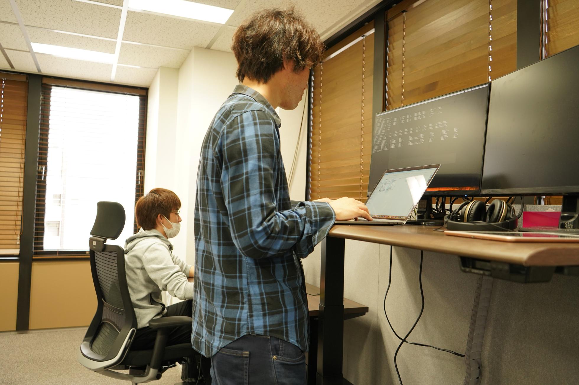 スタンディングでも作業できるよう、デスクは昇降機能付き
