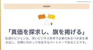 【MISSION】  ̄ ̄ ̄ ̄ ̄ ̄ ”なめらかな市場へ” 世の中には、素晴らしいポテンシャルがありながら、市場で過小評価された企業がたくさんあります。 商品・サービス・流通を正しい方法で正しい場所に配置することが、 そんな企業を輝かせる手段の1つであると私たちは考えます。 実力のある企業が正しく評価される、不要な摩擦のない"なめらかな市場"作りが、私たちが目指す社会への提供価値です。 【VISION】  ̄ ̄ ̄ ̄ ̄ ̄ "真価を探求し、旗を掲げる" そんなMISSIONを達成するため、我々は深いビジネス思考と一気通貫のデジタルマーケティングで、 企業のあるべき姿=真価を導き出し、目標に向かって伴走するパートナーであり続けます。