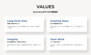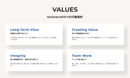 ■私たちが大事にしている4つの行動指針 (1) Long- Term View 長期的な目線で考えよう 100年先も通じるような、長い時間軸でも正しいと思えることを実践していきます。 (2)Creating Value 自分で価値創造を行おう 誰かに委ねることなく、自らの手で価値を作っていくことに取り組んでいきます。 (3)Integrity 高い倫理観を持ち、誠実に取り組もう 社内社外に関わらず、誰に対しても誠実に関わり続けることを期待しています。 (4)Team Work チームで前に進もう 楽しい時も、辛い時も、どんな時でも仲間と協力して一緒に前に進んでいきます。
