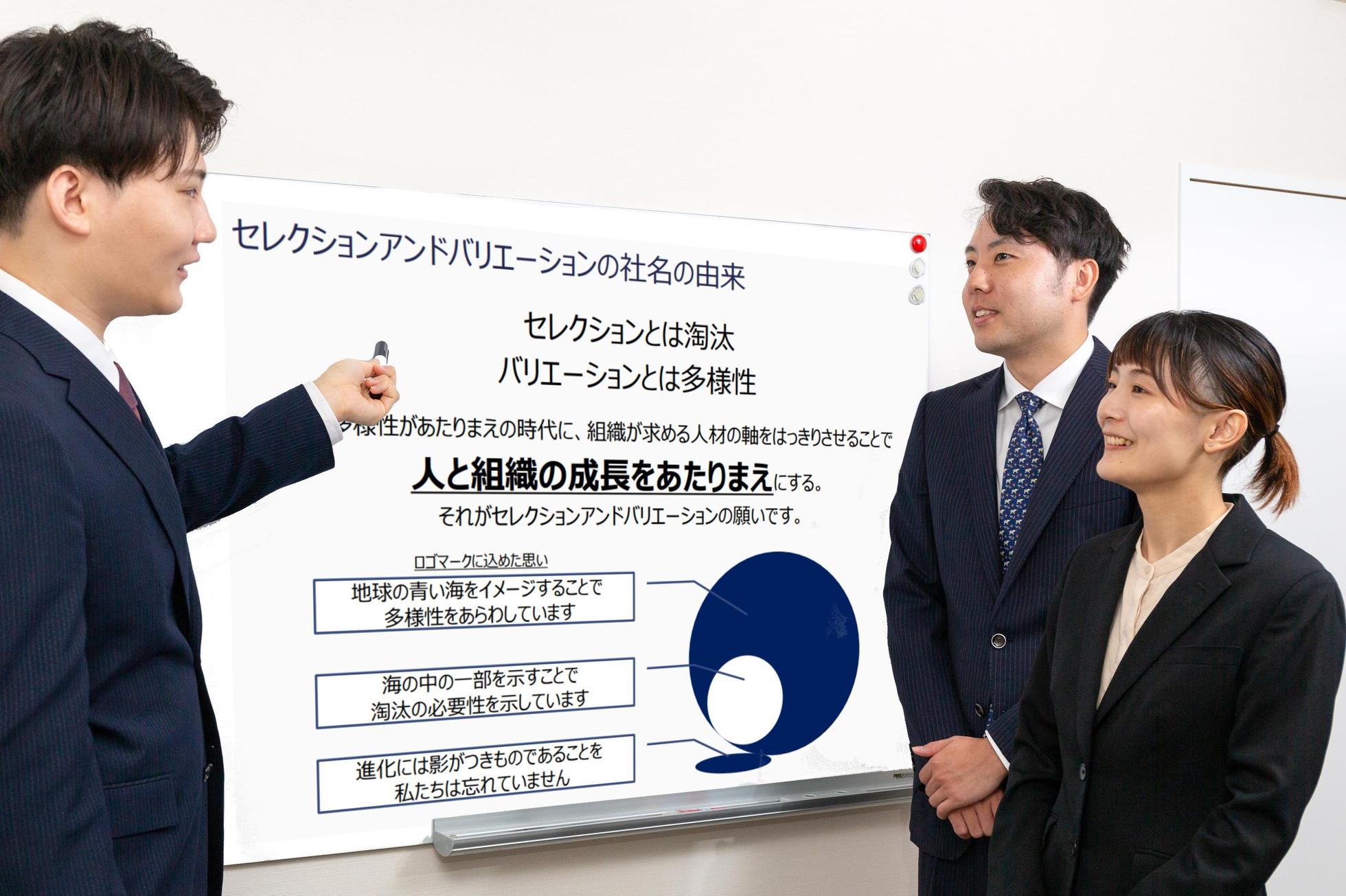 社名のセレクションアンドバリエーションには私たちの思いが込められています。 セレクションとは淘汰の仕組み、バリエーションとは多様性の仕組みであり、組織進化論のキーワードから命名しています。 なぜなら、あらゆる組織は、淘汰と多様性によって進化することが求められるからです。 だからこそ私たちは、「人と組織の成長をあたりまえにする」をモットーに、今後もさらなる調査・研究により、多くの企業の進化をご支援していきたいと思っています。 そのためには、優秀な人材を採用し、自発的な活動を促し、チームとして一丸となって業績向上に貢献する必要があると考えています。そのための人事制度設計と運用支援、人材教育を進めています。