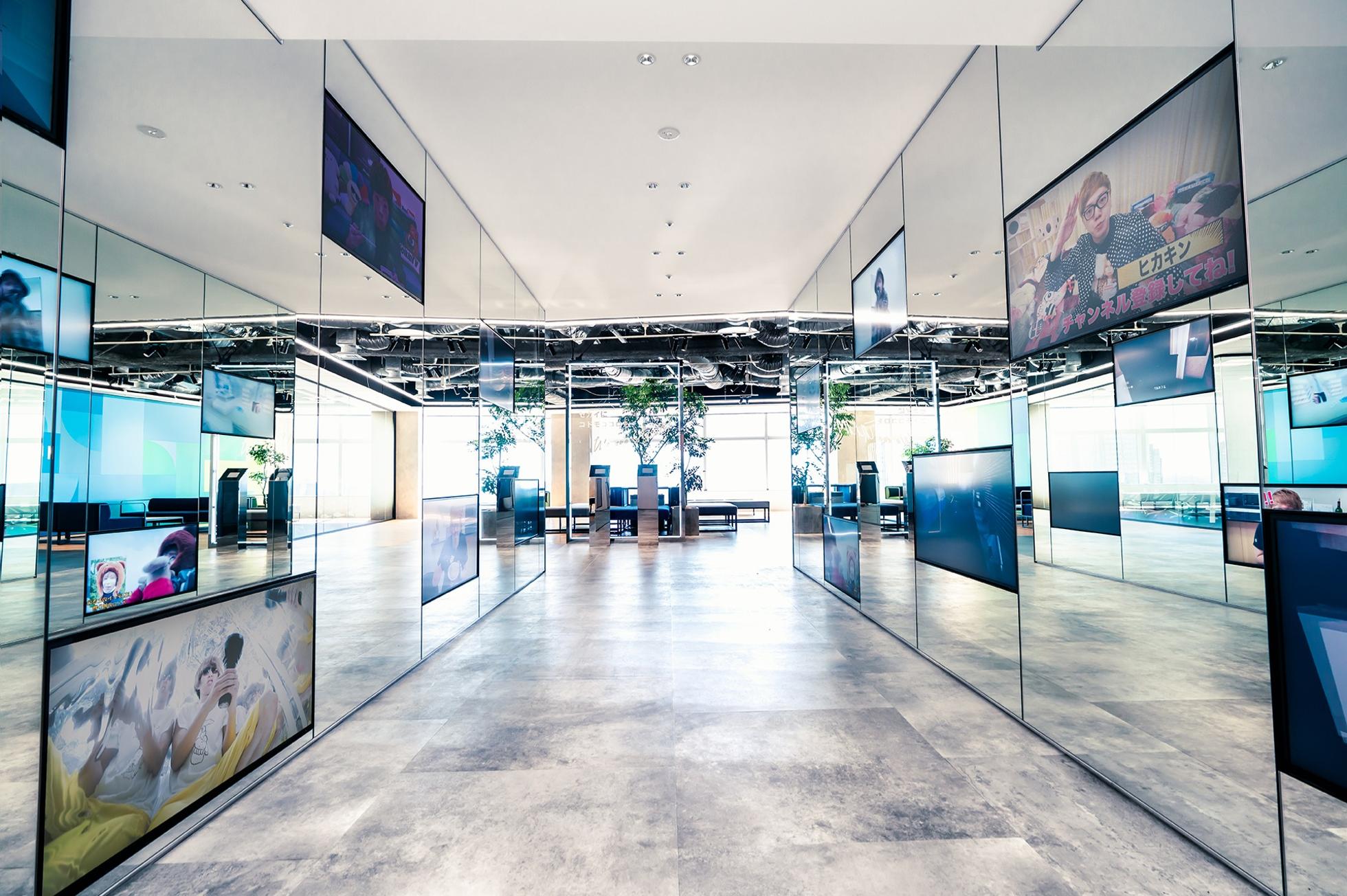 本社にはいくつかスタジオ機能も備えており、クリエイターのニーズに応じて撮影や編集のサポートを行っています。エントランスは、両側壁面がガラス張りとなっており、弊社ならではのオフィス環境となっております。