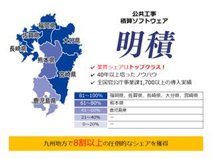 1989年に発売した主力製品である自治体向け土木積算システム『明積』は、全国約400の自治体で導入されているシェアトップクラスの積算ソフトで、導入自治体数は今も伸び続けています。