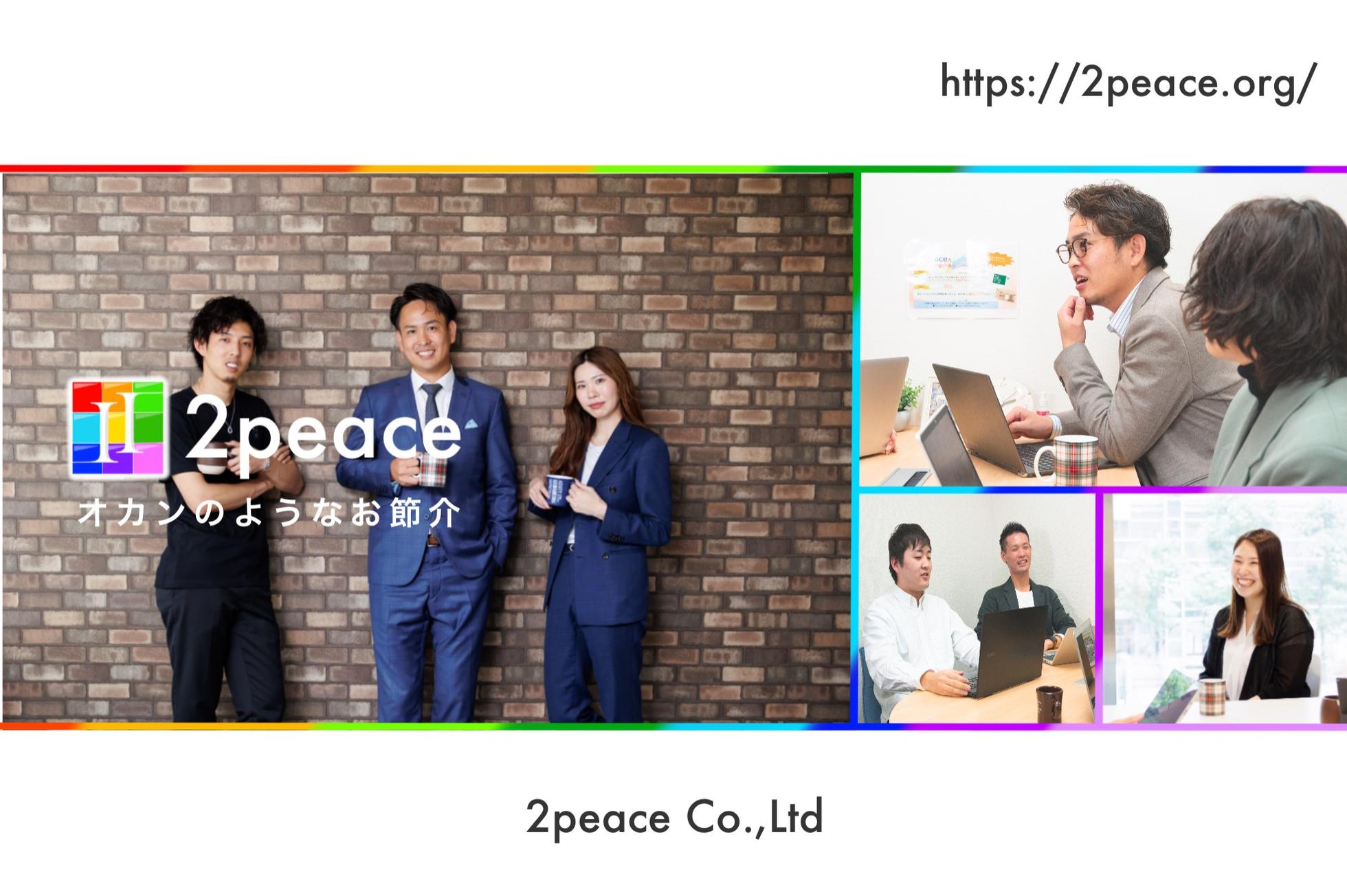 ■オカンのようにお節介で温かく■ 仕事は相手があって初めて成り立つもの。 自分に目を向けるのではなく、他人を思いやれる人間であり続けます。 ▍人財の力で企業の発展に役立ち、豊かで明るい社会づくりに貢献する。 私たちは「人間力」にフォーカスして、人財の皆さんにしっかりと指導、教育を行っています。 人財には2peaceで働くメンバーだけでなく、これから仲間になる方、2peaceから羽ばたいていく方すべてを含みます。スキル・技術の大切さも理解しつつ、何よりも人間性のある人財を輩出してまいります。 ■起業から今につながるストーリー■ 当社代表が社会人人生を歩み始めた当時、自分のために勉強していた学生時代とは大きく変わり、社会では相手の満足度がそのまま自分に跳ね返ってくる感覚を知ることになります。セールスでも自分が売りたいものを売るのではなく、まずは自分を知ってもらい、自分のファンになってもらうことの大切さに気付きました。しばらくして体調を崩し、働くことの大変さ、尊さ、難しさを実感します。 世の中には自分と同じような思いを抱く人がいるはず。 そうした人たちの力になりたい。 自分だからできることがある。 そうは言っても企業に人材を紹介するだけでは、私がやる意味がないだろう。 ならば――。と社会貢献できる事業を結び付けて現在の2peaceを立ち上げます。 ■解決したい問題■ いじめ・不登校など学校にまつわる問題について行政や企業のアプローチが行われていますが、認知件数・生徒数はそれぞれ増加しています。これらの問題には学生時代の過ごし方が深く関わっていると私たちは考えました。実際の活動として当社事業の一環で学校を回って研修を実施し、不登校の状態にいた生徒が通学・登校できるようになったケースもあります。 この取り組みを就職活動につなげれば、学生本人が社会に出て誰かの役に立てるようになります。地方で行えば地域に活力が生まれ、いずれ過疎化が解消されていくはずです。 2peaceは組織体制を整えつつ事業会社を立ち上げ、雇用を賄える環境をつくり、ゆくゆくは地方での人材育成を開始。リモートでも働ける環境をつくっていく所存です。