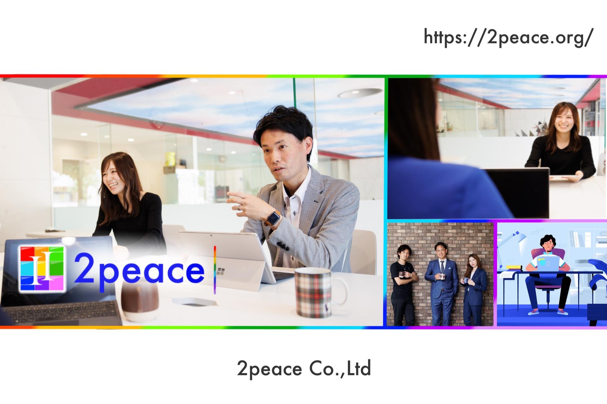 ■オカンのようにお節介で温かく■ 仕事は相手があって初めて成り立つもの。 自分に目を向けるのではなく、他人を思いやれる人間であり続けます。 ▍人財の力で企業の発展に役立ち、豊かで明るい社会づくりに貢献する。 私たちは「人間力」にフォーカスして、人財の皆さんにしっかりと指導、教育を行っています。 人財には2peaceで働くメンバーだけでなく、これから仲間になる方、2peaceから羽ばたいていく方すべてを含みます。スキル・技術の大切さも理解しつつ、何よりも人間性のある人財を輩出してまいります。 ■起業から今につながるストーリー■ 当社代表が社会人人生を歩み始めた当時、自分のために勉強していた学生時代とは大きく変わり、社会では相手の満足度がそのまま自分に跳ね返ってくる感覚を知ることになります。セールスでも自分が売りたいものを売るのではなく、まずは自分を知ってもらい、自分のファンになってもらうことの大切さに気付きました。しばらくして体調を崩し、働くことの大変さ、尊さ、難しさを実感します。 世の中には自分と同じような思いを抱く人がいるはず。 そうした人たちの力になりたい。 自分だからできることがある。 そうは言っても企業に人材を紹介するだけでは、私がやる意味がないだろう。 ならば――。と社会貢献できる事業を結び付けて現在の2peaceを立ち上げます。 ■解決したい問題■ いじめ・不登校など学校にまつわる問題について行政や企業のアプローチが行われていますが、認知件数・生徒数はそれぞれ増加しています。これらの問題には学生時代の過ごし方が深く関わっていると私たちは考えました。実際の活動として当社事業の一環で学校を回って研修を実施し、不登校の状態にいた生徒が通学・登校できるようになったケースもあります。 この取り組みを就職活動につなげれば、学生本人が社会に出て誰かの役に立てるようになります。地方で行えば地域に活力が生まれ、いずれ過疎化が解消されていくはずです。 2peaceは組織体制を整えつつ事業会社を立ち上げ、雇用を賄える環境をつくり、ゆくゆくは地方での人材育成を開始。リモートでも働ける環境をつくっていく所存です。