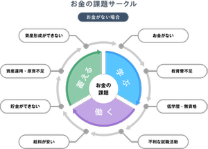「お金の課題」の発生原因を考えていくと、人生を構成する「学ぶ」「働く」「蓄える」という各フェーズが密接に関係していることがわかります。