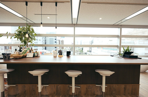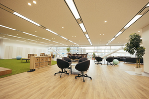 1フロアのオフィスには芝生やこたつのスペースもあり、メンバー間のコミュニケーションの機会を大事にしています。