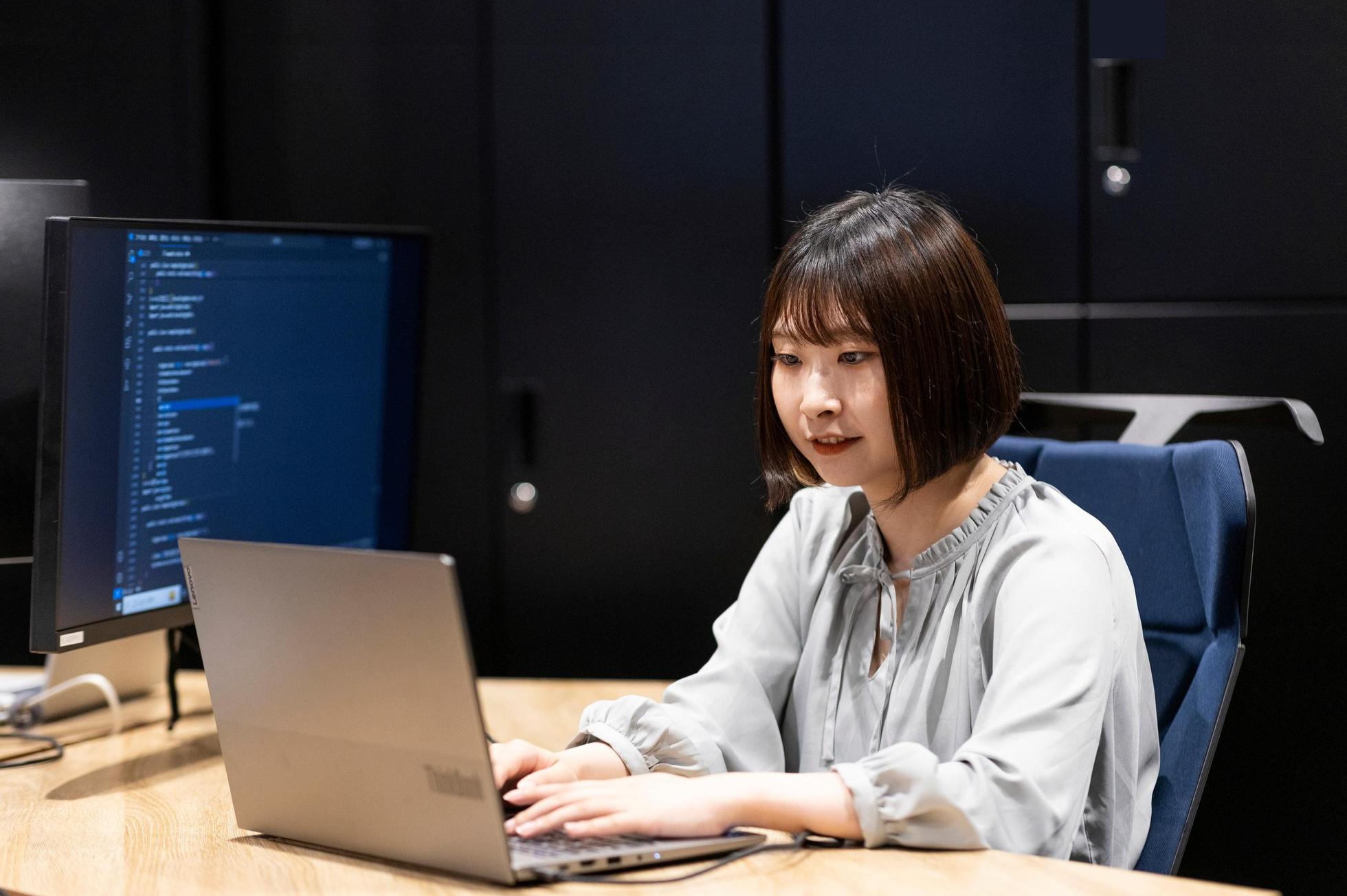受託ルーム。デュアルモニター、広々としたデスク、落ち着いた空間で、エンジニアのみなさんが集中しやすい環境を整えてお待ちしております!