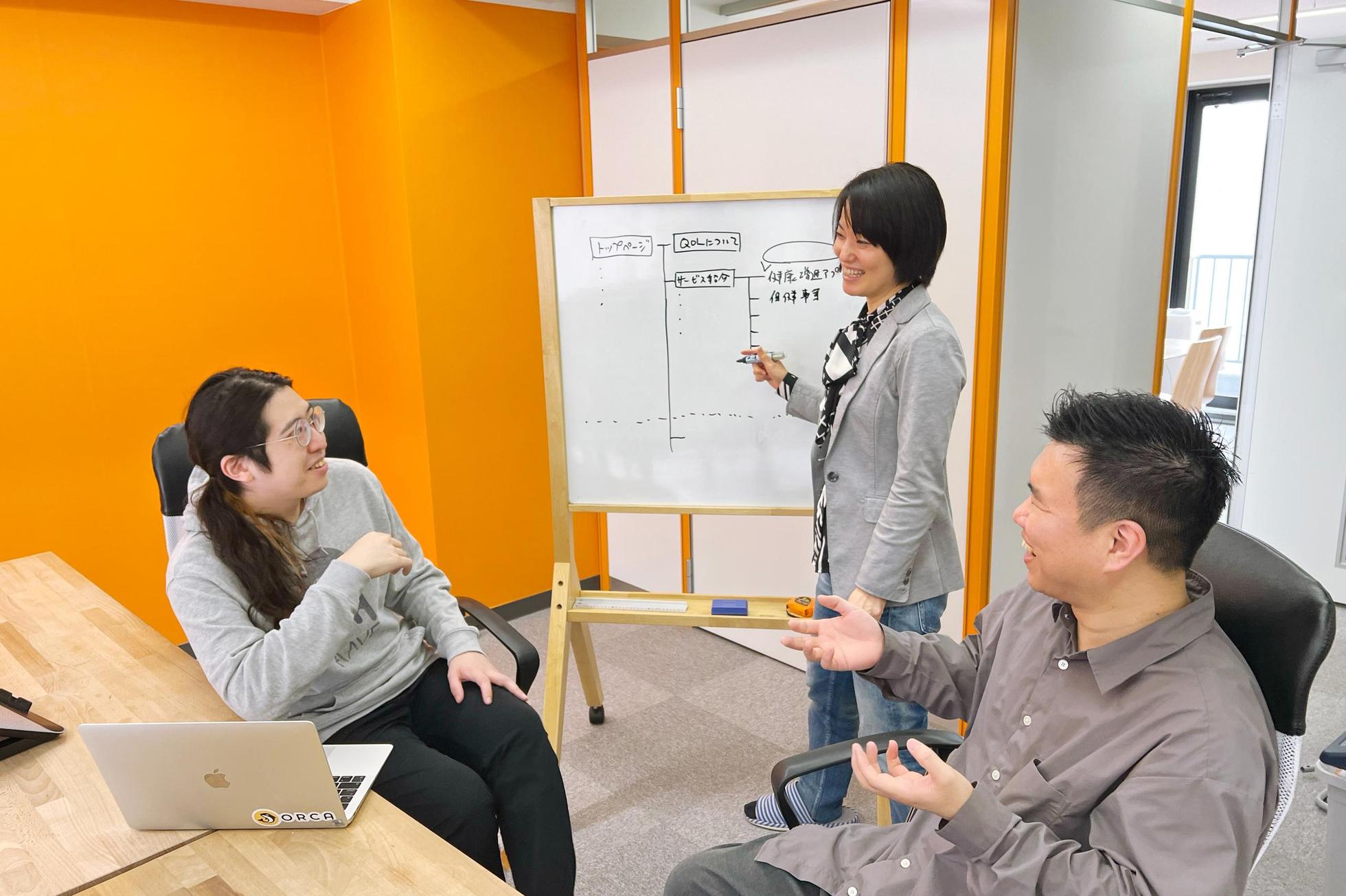 こちら大阪オフィスのメンバー。社長(中央)を中心にサクッとミーティング。堅苦しさはありませんが、適度に互いをリスペクト。新しい仲間がなじみやすいニュートラルな雰囲気。