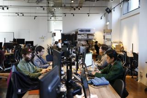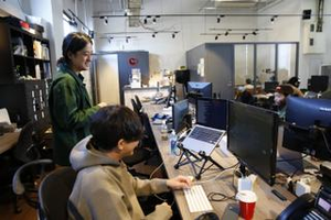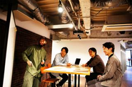 元々撮影スタジオがあったフロアに作られたオフィス。天井が高く、明るい日差しが降り注ぐ空間です。