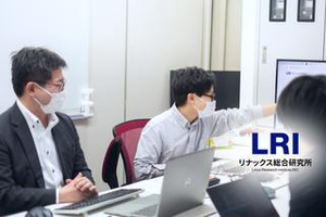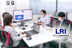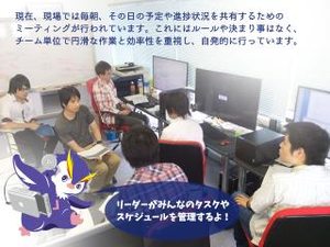 本社の開発風景。奥の壁に掲げてあるのは企業理念の言葉。