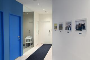 ブルーが基調の清潔感あるエントランス