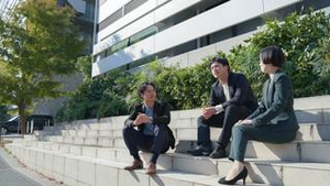 社員の雑談風景。リフレッシュのために散歩しながらミーティングしたりすることもあります。