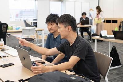 終業後にオフィスのリフレッシュスペースで行われるエンジニアの「ゆる会」。開発の方向性をフランクにディスカッションしました