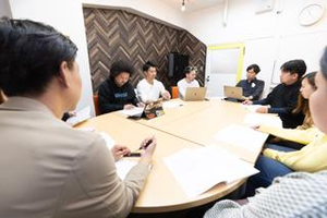 月一の全社MTGの様子。部署関係なく一堂に集まり、意見交換や発表をする場になっています。他部署と交流をすることにで自分の業務にも生かせることの発見など視野が広がります。