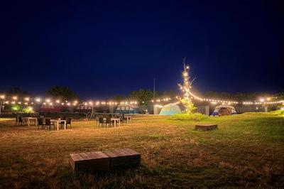 再生したちくらつなぐホテルの庭に設置した大型テントとファイヤープレイス