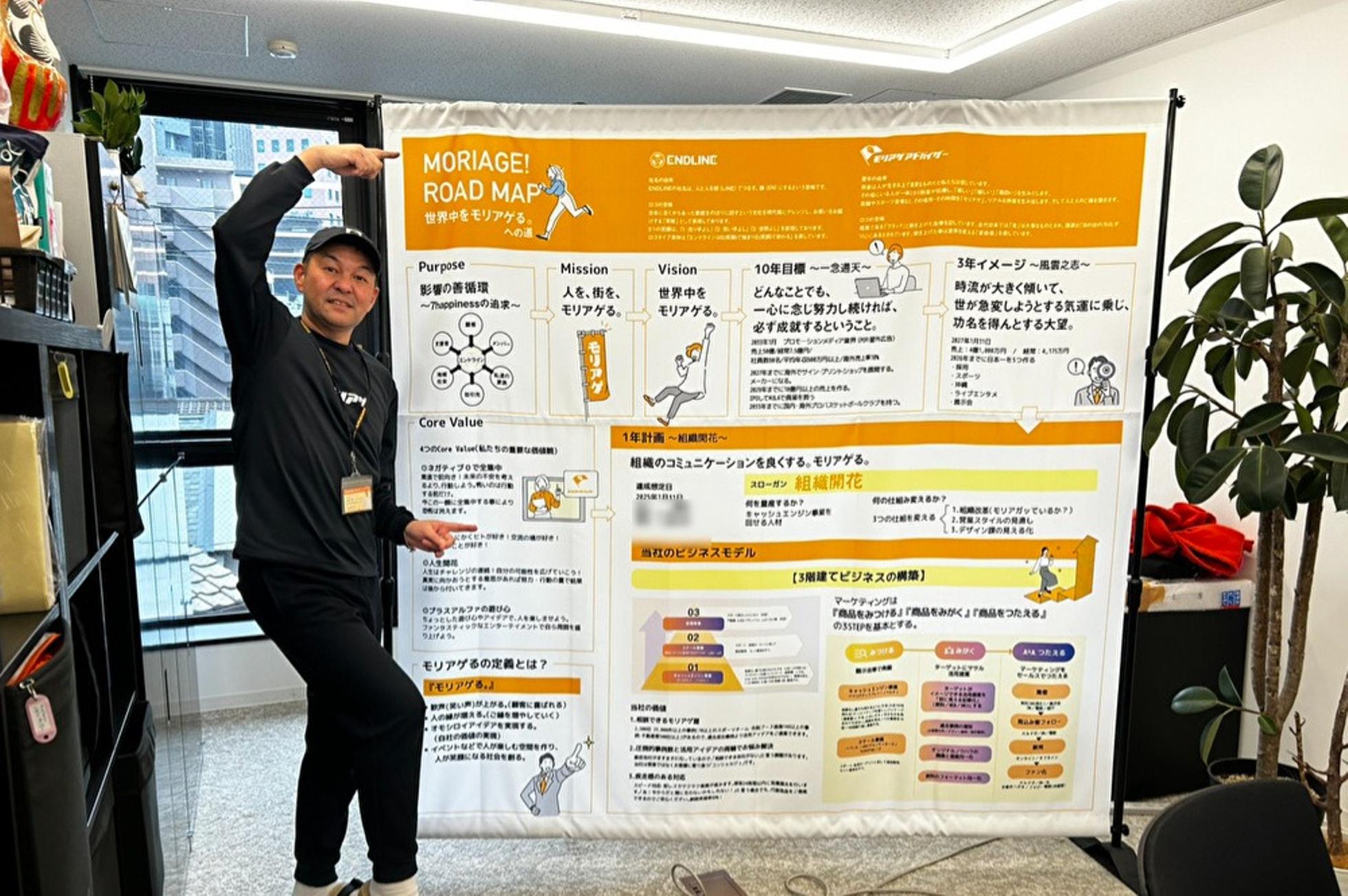 Purpose|影響の善循環~7happinessの追求~ 私たちは、関わるすべての人・企業・街がポジティブに影響し合い、 その“善い循環”が広がっていく社会を目指しています。 モリアゲの力で笑顔と元気を生み出し、周囲に良い連鎖を起こしていく。 それが、エンドラインの存在意義です。 Mission|人を、街を、モリアゲる。 イベントも、店舗も、不動産も、採用も。どんな場所にも「人の想い」があります。 私たちはその想いをかたちにし、人が集まり、心が動く瞬間をつくります。 “モリアゲ”とは、ただ派手にすることではなく、 人の心に火を灯すこと。それが、私たちの使命です。 Vision|世界中をモリアゲる。 日本中のスポーツチーム、企業、そして街へ。 アジアへ、そして世界へ。 “モリアゲ”という文化を世の中に広げ、笑顔と熱狂を生み出す。それが、私たちの描く未来です。 Values|7つのモリアゲの約束 ① 成長 昨日より今日、今日より明日。他人ではなく「自分」を超える努力を続けよう。 ② 挑戦 新しいことにワクワクしながら、自分の殻を破り、限界を突破しよう。 ③ 素直 人の声に耳を傾け、まずは受け止める。素直さが、チームを強くする。 ④ 思いやりと感謝 「ありがとう」の気持ちを忘れずに。支え合い、優しさを連鎖させよう。感謝の心が、すべてのモリアゲの原動力になる。 ⑤ 遊び心 「ちょっとおもしろい」を足して、みんなを笑顔にする仕掛けを生み出そう。 ⑥ チーム 一人ではできないことも、仲間とならできる。笑顔で支え合う最高のチームをつくろう。 ⑦ 人の縁 どれだけ技術が進化しても、最後に残るのは“人”。人との縁こそが、人生を豊かにし、未来を変えていく。 ご縁を大切にし、モリアゲの輪を広げていこう。 【モリアゲ代表 山本の物語】 私、山本啓一は、もともとスポーツビジネスの世界にいたわけでも、経営学を専門的に学んできたわけでもありません。大学を5年在籍した末に中退し、その後は芸人という全く異なる道に飛び込みました。 芸人時代の仕事は、いかにその場にいる人たちを笑わせ、場を盛り上げ、空気を一瞬で変えるか。会場の反応は、言葉や間の取り方、テンポや表情のわずかな違いで大きく変わります。うまくいけば、観客が一斉に笑い、会場が温かい空気で包まれる。しかし逆にスベれば、しんと静まり返った空気が漂い、その場にいる全員が居心地の悪さを感じる——そんな緊張感と隣り合わせの毎日でした。 正直に言えば、私は芸人として大きく成功したわけではありません。それでも、ステージに立ち続けた日々で確信したことがあります。それは、「人の感情を動かすことは、その場の空気も、人の心も変える力がある」ということです。笑いも、歓声も、感動も、その場のエネルギーが人の背中を押し、時に人生の方向を変えるほどの影響を与えることがある——その瞬間を何度も見てきました。 芸人を辞め、初めて就職した会社で飛び込み営業を経験し、3年で売上1億円を達成。その後、2004年にエンドライン株式会社を創業しました。当初はただ「売れるものを売る」ビジネスでしたが、やがて自分の中で違和感が芽生えます。商品を届けるだけでは足りない。本当に価値があるのは、お客様がその商品を使って得られる体験や成果——つまり、その場が盛り上がる瞬間なのではないかと。 そうして私は、芸人時代に培った「場を盛り上げる力」をビジネスに取り入れることを決意しました。単なる販促物の納品ではなく、「人を、街を、モリアゲる」ためのディスプレイや企画を提案する会社へと舵を切ったのです。 プロスポーツチームの会場装飾や、採用イベントのブースデザイン、不動産や店舗の販促支援——すべての仕事の根底には、「その場の空気を変え、人の感情を動かし、関わる全員を元気にする」という想いがあります。芸人としてステージに立ったときのように、お客様とその先にいる人々が笑顔になる瞬間をつくることこそ、私にとっての使命です。 だからこそ、エンドラインのMissionは「人を、街を、モリアゲる」。そしてVisionは「世界中をモリアゲる」。これは単なるスローガンではなく、私自身の原体験から生まれた、生涯をかけてやりたいことなのです。