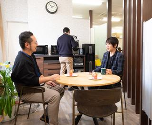 本社オフィスにあるちょっとした休憩スペース。お昼を食べたり一息ついたり、仲間とのコミュニケーションの場としても活用されています。中には”ドーナツ会議”を開催するチームも。