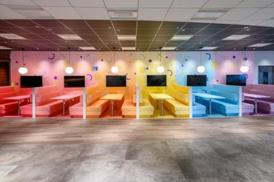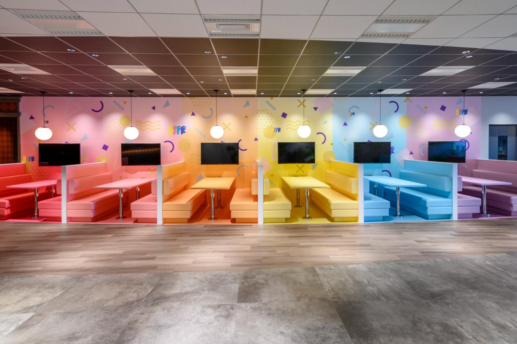 カラフルなカフェスペース、緑あふれる自然エリア、ダーツバーのような遊び心のあるオフィス