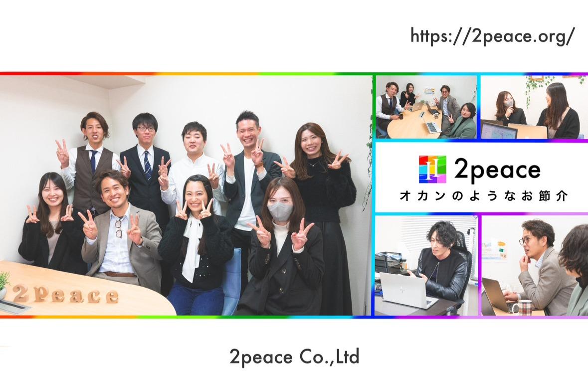 株式会社2peaceは「オカンのようなお節介で温かく」をスローガンに、企業の採用活動と求職者の転職活動支援をメインに事業を展開している、大阪のベンチャー企業です。 人財紹介/人財派遣/人財教育/HRコンサルティングまで、人に関わるあらゆる悩みを解決します。 「無資格・未経験」でも社会参画できる仕組みを作り出し、採用市場の変化と、採用現場の動向をしっかりと捉え、企業も働く人も前向きに社会貢献ができる世の中を、人財事業を通じて創出していきます。 【事業内容】 「人財紹介」 全国求人案件数20000件。求職者エントリー数1000人超/月を取り扱っています。「求職者ファースト」の寄り添い方で、全国の転職市場を支えます。求職者だけではわからないこと、判断しづらいことも、転職までの伴走支援でサポートします。20代〜40代の転職を積極的に応援しています。また製造業の転職支援も積極的に取り組んでおり、大手製造会社から地方の町工場まで幅広く取り扱っています。 「人財派遣」 関西を中心に幅広く対応しています。特に製造/販売/営業/事務といった安定した継続的な仕事に強く、就職後も徹底した伴走サポートを行います。 「HRコンサルティング」 条件だけでは差別化できない企業を中心に、採用の「見える化」を基準に採用につながるコンサルティングを行っています。MVVの再設定から、労務環境の改善、人事評価制度の設定まで、人財紹介会社の領域を超えて伴走支援を行なっています。 「インターン生の採用」 新卒採用支援を行いながら、自社のインターン生採用も取り入れています。企業には社員が、学生にはインターン生がアプローチを行う形式を採用しています。学生の理想の就活を形にするために、学生ならではの発想とポテンシャルで活躍の場を提供しています。 「キャリア教育事業」 中高生を中心に、働く意味と働くことに対する考えを、遊びの中から学ぶ「アソビカケル」事業を展開しています。職能ではなく「人間力」を養うきっかけをキャリア教育の中から創っていきます。 「SES事業/エンジニア雇用」 エンジニア人財の雇用を支えるために、2024年からSES事業の展開をしています。正社員、契約社員、業務委託と働き方も様々になります。全国の案件を扱い、エンジニア能力に合わせて幅広い提案ができるように取り扱っています。 【今後の展望】 2025年には、社員数を20名に増やす計画です。各業種の担当を専任で任せ、より広い業種に、より深く関われるように事業規模拡大を計画しています。またM&Aによる事業規模拡大も計画しており、人財会社だけでは満たせなかった領域まで一貫したサポートができるように展開していく計画です。 売り上げ規模と共に、当社のサービスを通して世の中にどんな変革を与えられるかを大切にしています。また、社会問題にアプローチできる事業を設計して、社会貢献を軸に世の中を変えられるサービスを創り「あなたにとって唯一無二の存在」となることを目指します。 【熱くなれる仲間募集】 若手人財を中心に、人の想いに共感し、ともに成長できる仲間がたくさん集まっています。 ・人の事を大切にできる方。 ・一丸となって、事業を作り上げたい方。 ・挑戦することを恐れず、成長意欲の高い方。