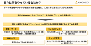 私たちAlmondoは、「テクノロジーで、あらゆる“ひと”の力を解き放つ」というミッションのもと、2023年2月に設立されたAIスタートアップです。創業メンバーは、東京大学松尾研究室の出身者で構成されており、最先端のAI技術を活かして事業を展開しています。 これまで、ナレッジ抽出やデータ構造化を中心に、PoCやプロジェクトを多数手がけてまいりました。DCMや東京ガス、IHI、伊藤忠テクノソリューションズ(CTC)など、大手企業向けにAIナレッジ基盤の構築や特化型モデルの開発、AIシステムの導入などを支援しております。 2024年12月には、東証スタンダード上場企業である株式会社テンダと資本業務提携を締結。現在は、インターフェース・アルゴリズム・データを組み合わせた「AIエージェント(チャットボットやAI VTuberなど)」の開発に取り組み、さまざまな業界や業務への応用を進めています。 私たちの開発の特長は、「人に寄り添うAI」をつくることです。たとえば営業・マーケティングでは、行動ログから自動でペルソナを推定し、個別の提案を生成します。バックオフィスでは、情報収集からレポート作成、通知まで含めたルーティン業務の自動化を実現しています。接客やカスタマーサポートでは、音声やチャットを通じたAIによる対応を可能にし、ナレッジ管理では、マニュアルやログを瞬時に整理・構造化し、検索性を高める仕組みを提供しています。 現在、私たちは「第二創業期」ともいえる新たなステージに差しかかっております。これまではPoCやプロトタイプの開発が中心でしたが、2025年からは、顧客業務全体をAIで最適化する「AIフルスタック開発」へと本格的にシフトしてまいります。これは単なるプロダクト提供にとどまらず、SIやコンサルティング領域にも踏み込む新たな挑戦です。 スタートアップとしての機動力と、テンダ社が持つ経営リソースの融合により、Almondoは「真のフルスタックAI企業」として、さらに進化してまいります。