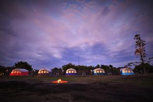 再生したちくらつなぐホテルの庭に設置した大型テントとファイヤープレイス