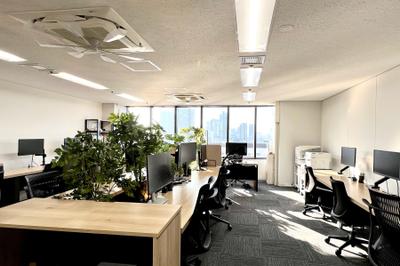 広さはコンパクトながら、全席フリーアドレスで自由に作業が可能。27インチモニターも完備し、効率的に働ける環境です。