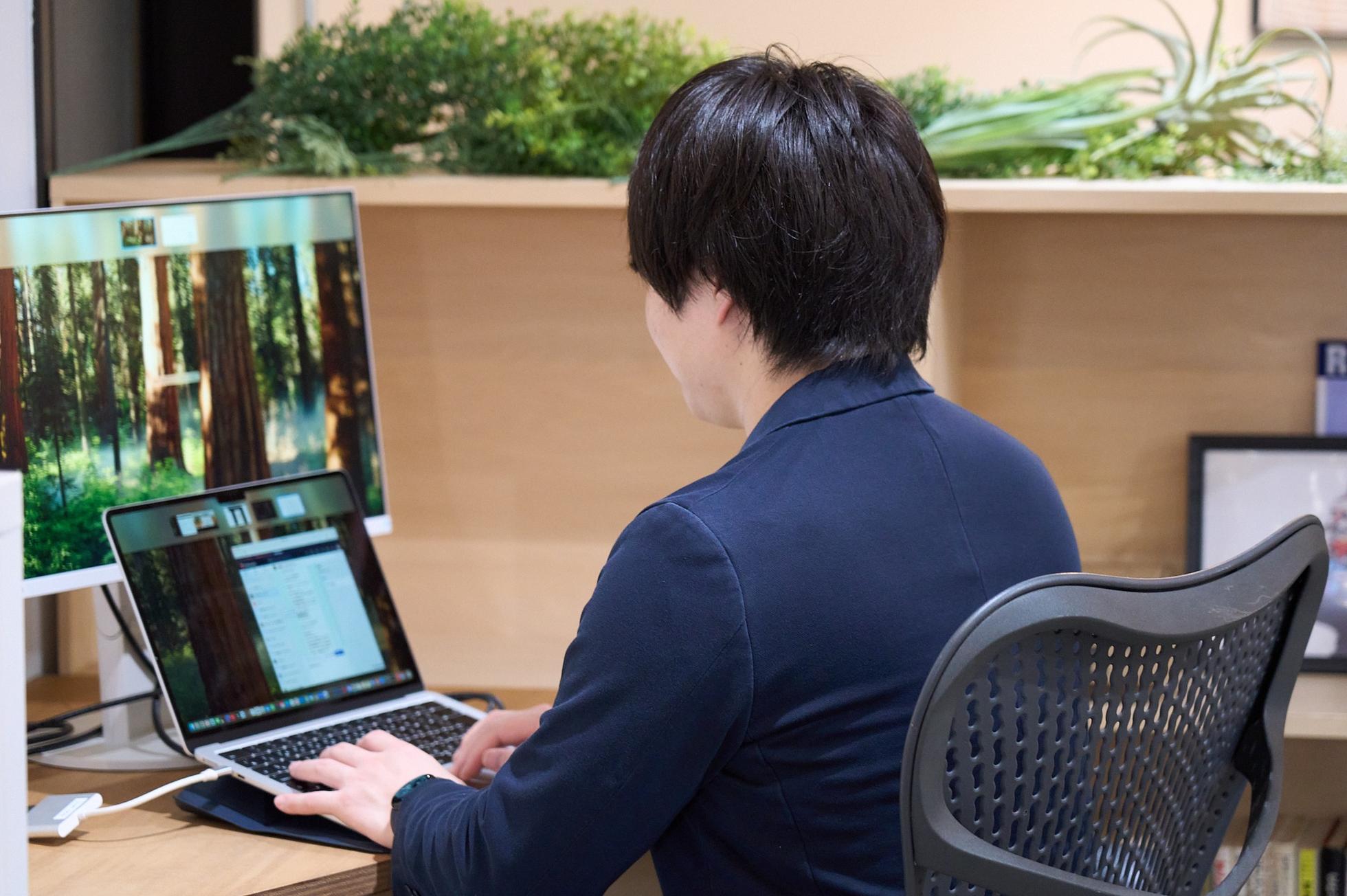 リモート対応や打合せがふえて、大きなモニターをフル活用。専用カメラ・スピーカーなど環境は万全です。