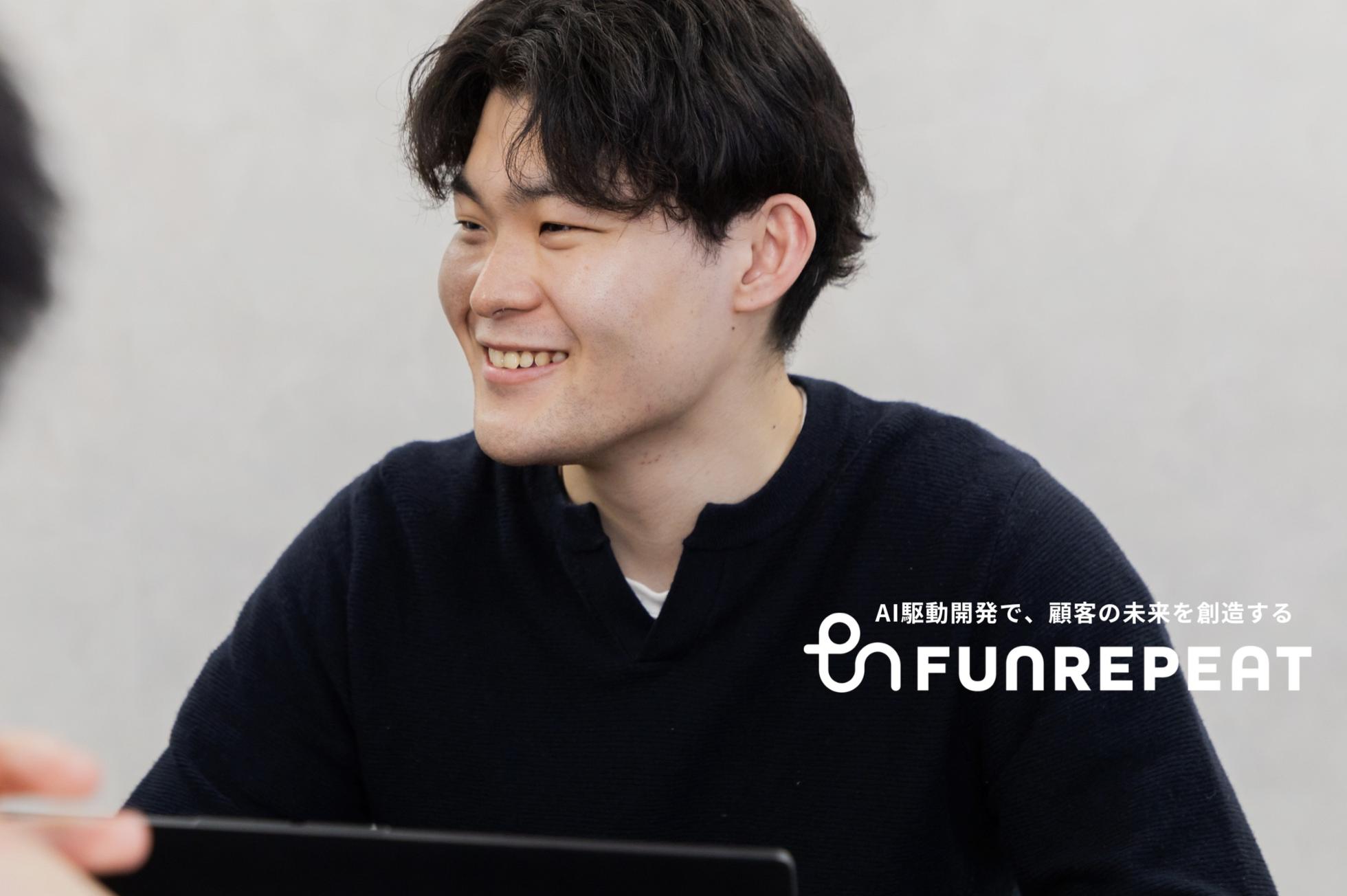 1997年生まれ / 北海道出身 ABOUT / 概要 ¨¨¨¨¨¨¨¨¨¨¨¨¨¨¨¨¨¨¨¨¨¨¨¨¨¨¨¨¨¨¨¨¨¨¨ 通信業界で個人・法人営業の両方を経験。 個人営業では16店舗中1位/年の実績貢献、法人営業では12人在籍している営業部門の中で1位/年の実績を獲得しました。 営業活動を通じて、「モノでなく顧客の業務課題をソフトウェアで解決することに対する魅力を感じたこと」や 「営業ではなく、より顧客に寄り添い伴走できる仕事がしたい」という思い、「AIの台頭もあり自分でもシステムを作れるのでは?」という思いなどからエンジニアの学習を始め、ファンリピートに入社しました。 現在は、エンジニア業務だけでなく、プロジェクトマネジメント領域や、これまでの営業経験を活かした顧客折衝、顧客の内製化支援や、AI導入レクチャーなどのコンサルティング的な業務も行っています。 どうすれば顧客と中長期的に関わっていけるのか、そのために何が出来るのかを考え、エンジニアの領域からコンサルティング領域を含め、プロダクトマネージャーのようになれることを目指して業務に取り組んでいます。
