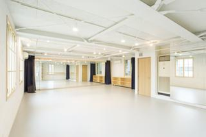 ミュージカルのお稽古を行う、自社2Fのスタジオです。大きな窓が多くあり、暖かな光が差し込むスタジオです。