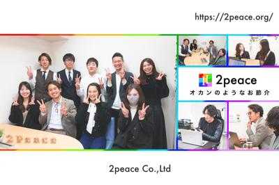 ■オカンのようにお節介で温かく■ 仕事は相手があって初めて成り立つもの。 自分に目を向けるのではなく、他人を思いやれる人間であり続けます。 ▍人財の力で企業の発展に役立ち、豊かで明るい社会づくりに貢献する。 私たちは「人間力」にフォーカスして、人財の皆さんにしっかりと指導、教育を行っています。 人財には2peaceで働くメンバーだけでなく、これから仲間になる方、2peaceから羽ばたいていく方すべてを含みます。スキル・技術の大切さも理解しつつ、何よりも人間性のある人財を輩出してまいります。 ■起業から今につながるストーリー■ 当社代表が社会人人生を歩み始めた当時、自分のために勉強していた学生時代とは大きく変わり、社会では相手の満足度がそのまま自分に跳ね返ってくる感覚を知ることになります。セールスでも自分が売りたいものを売るのではなく、まずは自分を知ってもらい、自分のファンになってもらうことの大切さに気付きました。しばらくして体調を崩し、働くことの大変さ、尊さ、難しさを実感します。 世の中には自分と同じような思いを抱く人がいるはず。 そうした人たちの力になりたい。 自分だからできることがある。 そうは言っても企業に人材を紹介するだけでは、私がやる意味がないだろう。 ならば――。と社会貢献できる事業を結び付けて現在の2peaceを立ち上げます。 ■解決したい問題■ いじめ・不登校など学校にまつわる問題について行政や企業のアプローチが行われていますが、認知件数・生徒数はそれぞれ増加しています。これらの問題には学生時代の過ごし方が深く関わっていると私たちは考えました。実際の活動として当社事業の一環で学校を回って研修を実施し、不登校の状態にいた生徒が通学・登校できるようになったケースもあります。 この取り組みを就職活動につなげれば、学生本人が社会に出て誰かの役に立てるようになります。地方で行えば地域に活力が生まれ、いずれ過疎化が解消されていくはずです。 2peaceは組織体制を整えつつ事業会社を立ち上げ、雇用を賄える環境をつくり、ゆくゆくは地方での人材育成を開始。リモートでも働ける環境をつくっていく所存です。
