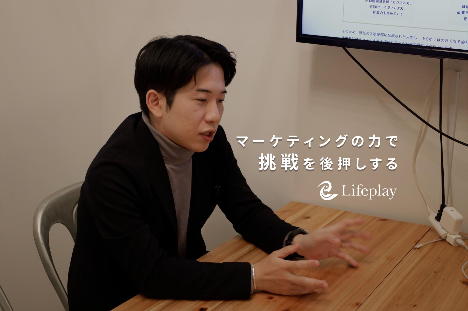 ▍Lifeplayについて 株式会社Lifeplayでは、「不動産」×「マーケティング」を主軸に、Webメディア運営、広告代理店、自社サービス開発など総合的に行なっています。SEO領域には特に強みを持っており、業界でもトップクラスの集客実績を誇ります。宅建業も自社で取得しており、不動産業界出身者や宅建資格を保有しているメンバーも複数在籍しています。 ▍将来の構想について 7期目までの期間を会社としてフェーズ1と位置付けており、不動産領域に特化し、Webマーケティング支援を一気通貫で実施できる状態を目指しています。8期目以降のフェーズ2では領域の垣根を超えて、「必要不可欠なサービス」を自社で創り続け、かつ「必要不可欠なサービス」を提供している企業様をマーケティングや資金面で支援することを目標に置いています。 長期的には、12期目で年商100億円という社会的インパクトを創出できる企業へと成長することを目標としています。そしてその先には、「Lifeplay」という存在自体が、社会にとって必要不可欠な存在であると認識されることを目指しています。 ▍事業サービスについて ①「不動産テックラボ」 不動産DXサービス紹介に特化した国内最大級のメディア。 上場企業を含む150社以上の不動産テック企業様の事例インタビューを掲載中。 またオリジナルのインタビューコンテンツをはじめ、業界全体のカオスマップの作成、ユーザーからのアンケート調査、サービスを実際に使用したレビュー記事など、一次情報に基づいたコンテンツを多数公開中。 ②「ASPLAY(アスプレイ)」 不動産領域を専門特化としたクローズドASP。 メディア運営に強みを持つ弊社ならではの独自アプローチで、広告主様の集客をサポートし、メディア様の収益最大化に貢献。 ③「Fund Search(ファンドサーチ)」 複数の不動産クラウドファンディングサービスに一括で会員登録できるサービス。 手軽に分散投資を始められるだけでなく、登録の手間を大幅削減。 不動産特定共同事業の許認可を取得しているダーウィンアセットパートナーズ社と共同開発。