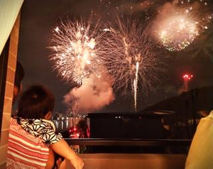 役員の社宅マンションから見る花火大会(真正面のベストポジション♪)。みんなでワイワイ楽しみます♪
