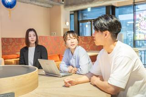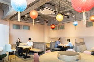 2022年2月に移転した新オフィス。占い要素が詰まったこだわりの空間になっています。1Fはカフェのような作りになっており、研修や懇親会などの集まりでも使用します。