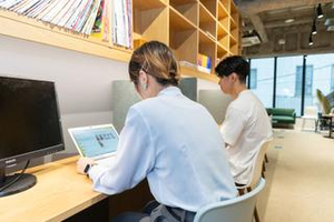 オフィスはフリーアドレスです。ソファー席、テーブル席、パーテーションのある席などがあり、業務や気分によって働く場所を選べるようになっています。