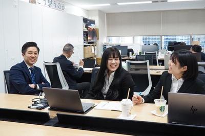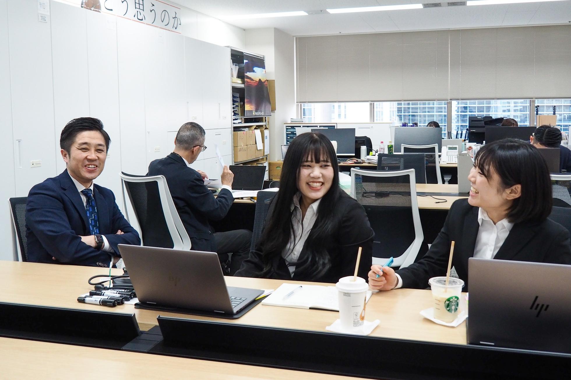 取締役と新入社員2名の休憩中の様子。