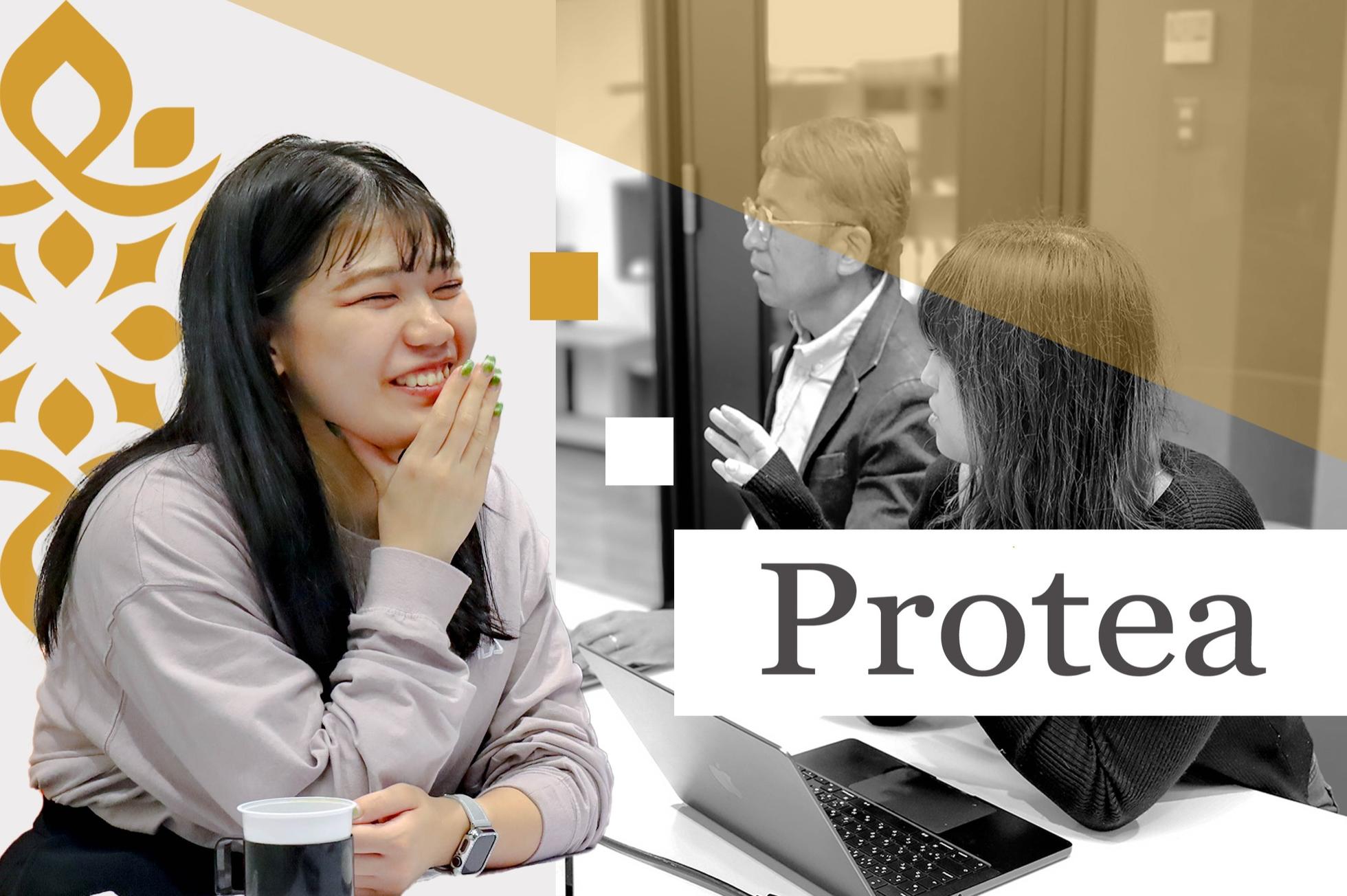 プロテアの花言葉は「王者の風格」「自由自在」「華やかな期待」 Proteaが目指すのは、無数に広がるWEBの世界で「自由自在」に戦略を組み、お客さまを業界の「王者」にする。 またお客さまもProteaにそれを「期待」する。 そして、関わる人々(お客さま)が繁栄し、Proteaも繁栄する。 逆に、お客さまの繁栄なくしてProteaの繁栄はない。 「すべてはお客様の繁栄のために」を社名に込めています。 そのために各部門の垣根を越えて、チーム体制をとっており、「スピード感」「成果」「WEBマーケティングのプロとしての意識」をもって各メンバーが業務にあたっています。 ワンフロアで業務を行っているからこそ困ったことや他のメンバーからの意見が必要になった際には、すぐに聞くことができ、一人ひとりが自分からアイディアを出せる環境です。
