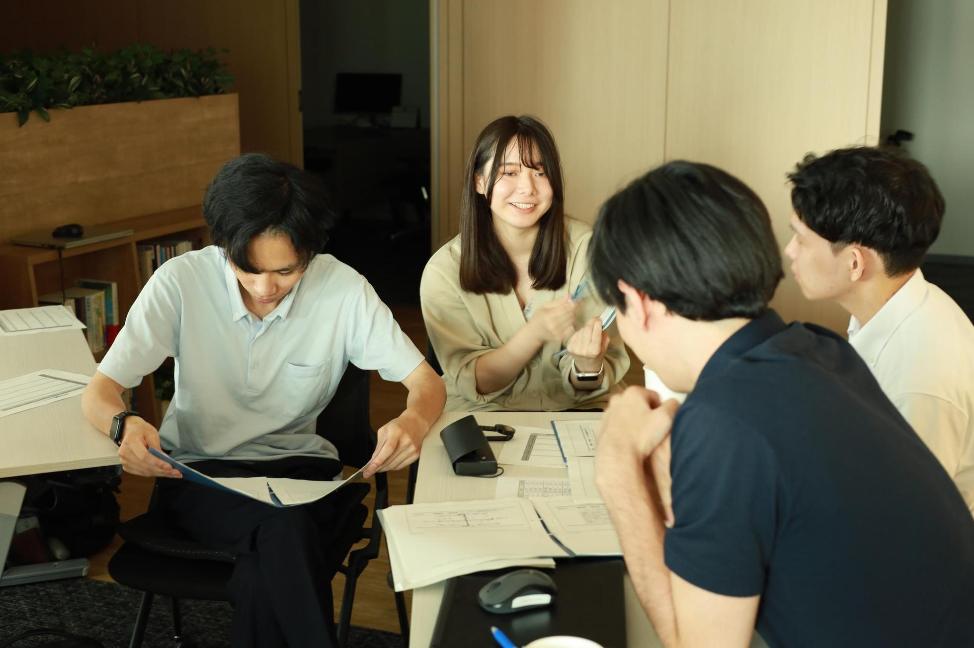 打ち合わせ中。HOMEがテーマの本社はリラックス感があるので、和やかな雰囲気で話し合いが進みます。