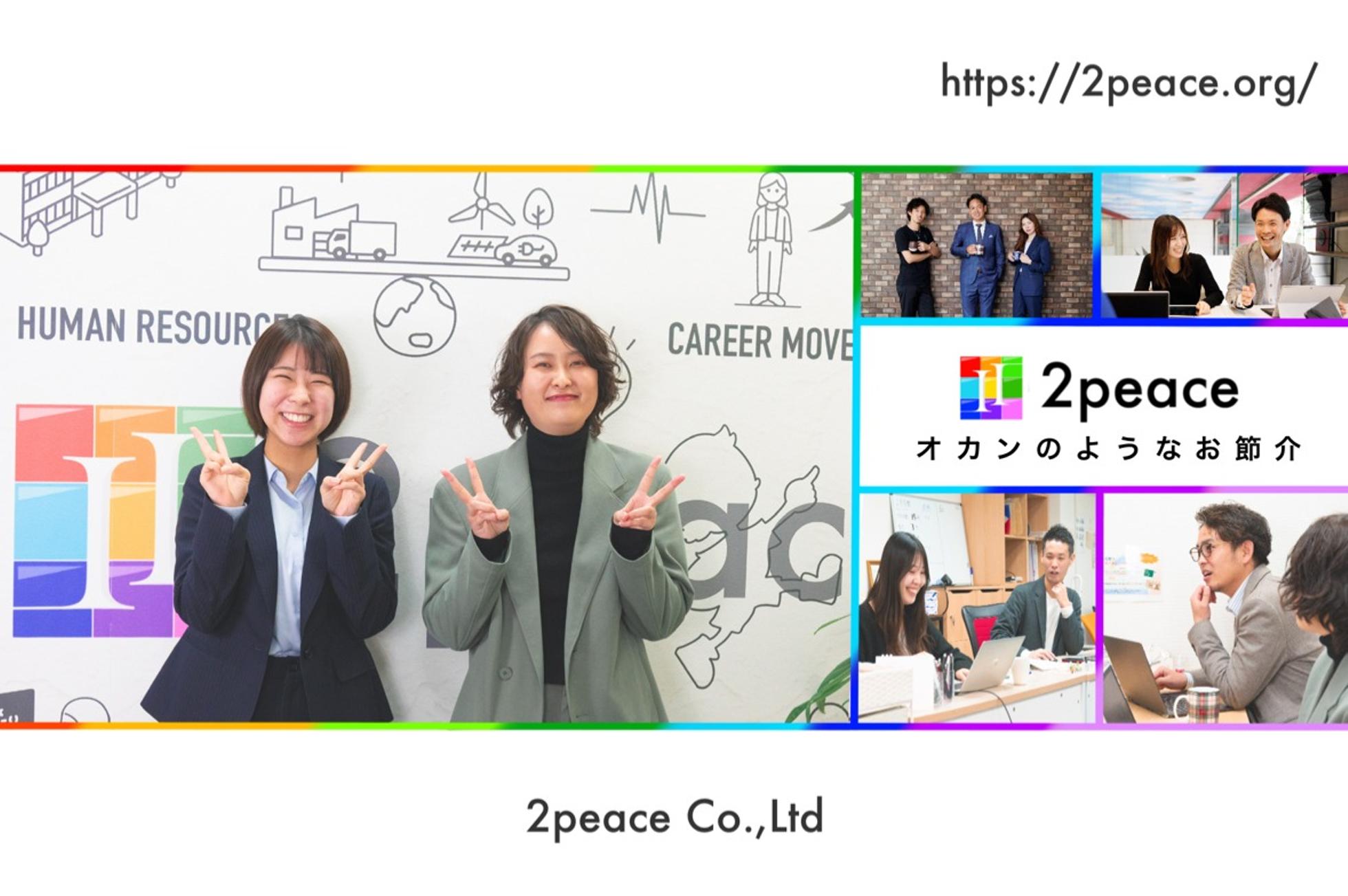 株式会社2peaceは「オカンのようなお節介で温かく」をスローガンに、企業の採用活動と求職者の転職活動支援をメインに事業を展開している、大阪のベンチャー企業です。 人財紹介/人財派遣/人財教育/HRコンサルティングまで、人に関わるあらゆる悩みを解決します。 「無資格・未経験」でも社会参画できる仕組みを作り出し、採用市場の変化と、採用現場の動向をしっかりと捉え、企業も働く人も前向きに社会貢献ができる世の中を、人財事業を通じて創出していきます。 【事業内容】 「人財紹介」 全国求人案件数20000件。求職者エントリー数1000人超/月を取り扱っています。「求職者ファースト」の寄り添い方で、全国の転職市場を支えます。求職者だけではわからないこと、判断しづらいことも、転職までの伴走支援でサポートします。20代〜40代の転職を積極的に応援しています。また製造業の転職支援も積極的に取り組んでおり、大手製造会社から地方の町工場まで幅広く取り扱っています。 「人財派遣」 関西を中心に幅広く対応しています。特に製造/販売/営業/事務といった安定した継続的な仕事に強く、就職後も徹底した伴走サポートを行います。 「HRコンサルティング」 条件だけでは差別化できない企業を中心に、採用の「見える化」を基準に採用につながるコンサルティングを行っています。MVVの再設定から、労務環境の改善、人事評価制度の設定まで、人財紹介会社の領域を超えて伴走支援を行なっています。 「インターン生の採用」 新卒採用支援を行いながら、自社のインターン生採用も取り入れています。企業には社員が、学生にはインターン生がアプローチを行う形式を採用しています。学生の理想の就活を形にするために、学生ならではの発想とポテンシャルで活躍の場を提供しています。 「キャリア教育事業」 中高生を中心に、働く意味と働くことに対する考えを、遊びの中から学ぶ「アソビカケル」事業を展開しています。職能ではなく「人間力」を養うきっかけをキャリア教育の中から創っていきます。 「SES事業/エンジニア雇用」 エンジニア人財の雇用を支えるために、2024年からSES事業の展開をしています。正社員、契約社員、業務委託と働き方も様々になります。全国の案件を扱い、エンジニア能力に合わせて幅広い提案ができるように取り扱っています。 【今後の展望】 2025年には、社員数を20名に増やす計画です。各業種の担当を専任で任せ、より広い業種に、より深く関われるように事業規模拡大を計画しています。またM&Aによる事業規模拡大も計画しており、人財会社だけでは満たせなかった領域まで一貫したサポートができるように展開していく計画です。 売り上げ規模と共に、当社のサービスを通して世の中にどんな変革を与えられるかを大切にしています。また、社会問題にアプローチできる事業を設計して、社会貢献を軸に世の中を変えられるサービスを創り「あなたにとって唯一無二の存在」となることを目指します。 【熱くなれる仲間募集】 若手人財を中心に、人の想いに共感し、ともに成長できる仲間がたくさん集まっています。 ・人の事を大切にできる方。 ・一丸となって、事業を作り上げたい方。 ・挑戦することを恐れず、成長意欲の高い方。