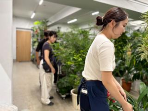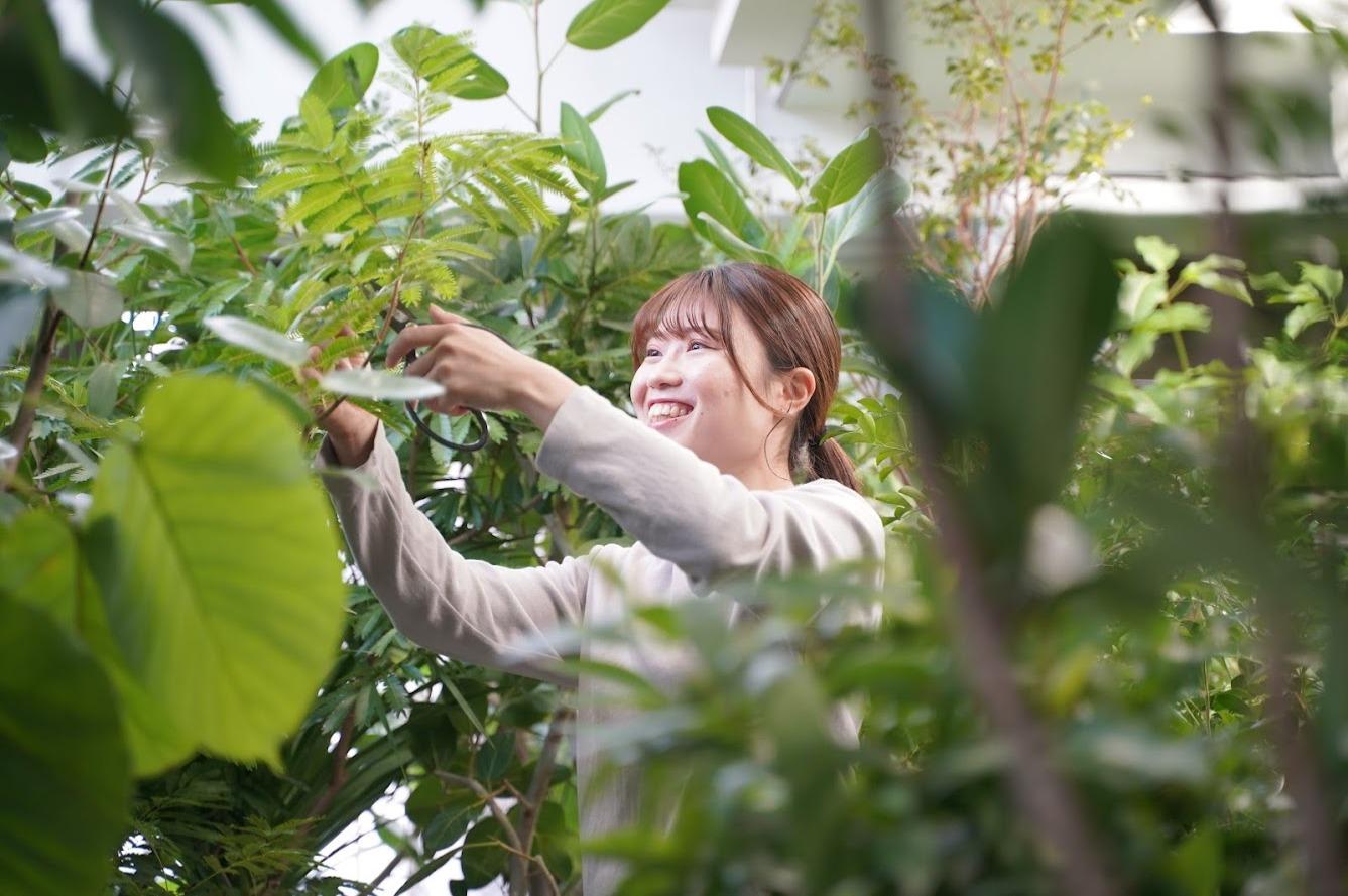 \\長島 花(Hana Nagashima)//営業サービス課 緑あるきれいな空間づくりに自分が貢献していることや、緑があるから店舗づくりが完結しているという、植物の重要性や仕事内容に惹かれました。この会社は「宇宙に植物を」という大きな目標を持っています。月旅行に行けるようになった今の時代、植物を宇宙に持っていくことが実現できるのかもしれない!ユニバーサルの社員として、そんな瞬間を経験したいと思ったことも、入社を決めた理由のひとつです。