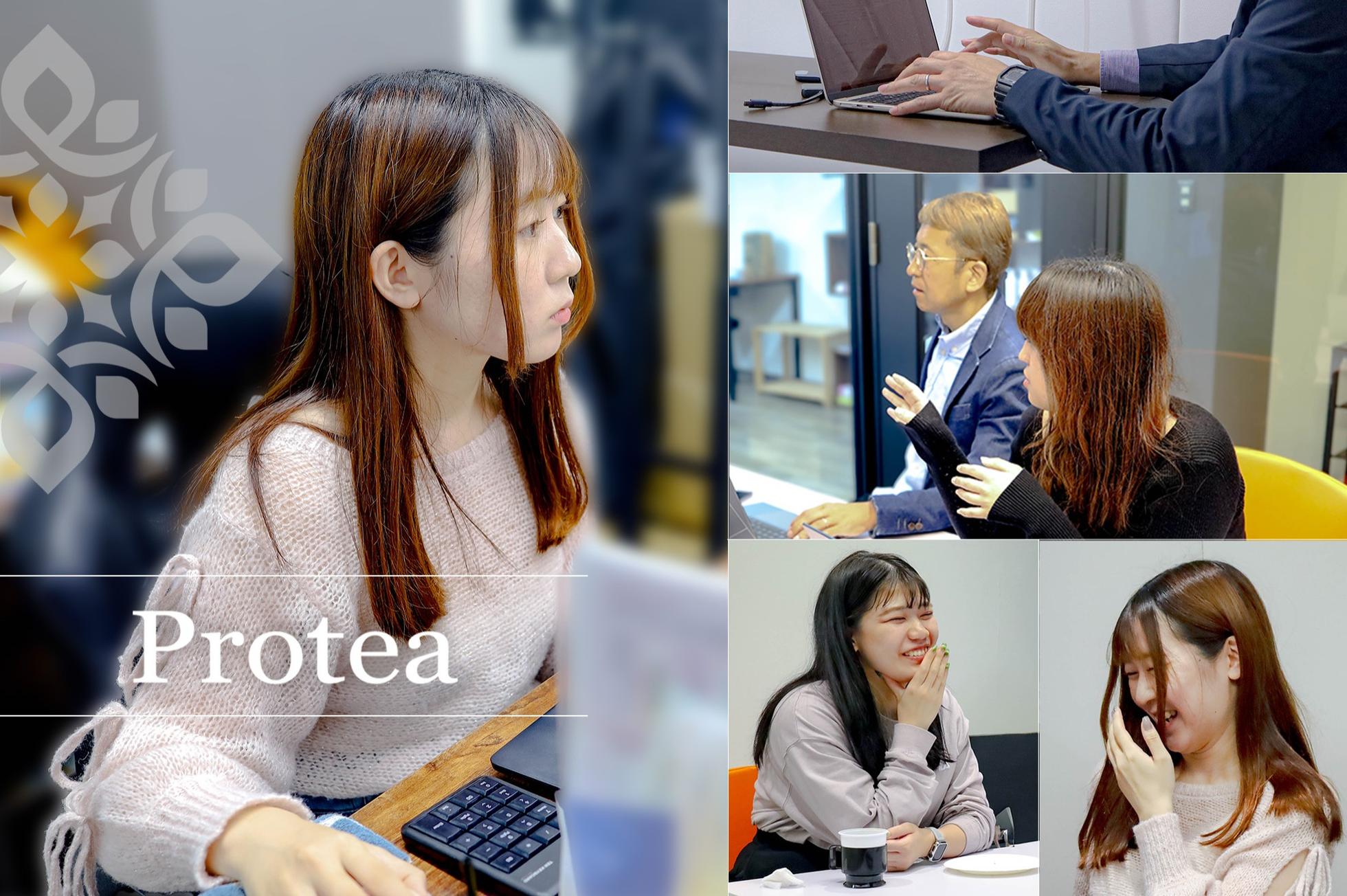 プロテアの花言葉は「王者の風格」「自由自在」「華やかな期待」 Proteaが目指すのは、無数に広がるWEBの世界で「自由自在」に戦略を組み、お客さまを業界の「王者」にする。 またお客さまもProteaにそれを「期待」する。 そして、関わる人々(お客さま)が繁栄し、Proteaも繁栄する。 逆に、お客さまの繁栄なくしてProteaの繁栄はない。 「すべてはお客様の繁栄のために」を社名に込めています。 そのために各部門の垣根を越えて、チーム体制をとっており、「スピード感」「成果」「WEBマーケティングのプロとしての意識」をもって各メンバーが業務にあたっています。 ワンフロアで業務を行っているからこそ困ったことや他のメンバーからの意見が必要になった際には、すぐに聞くことができ、一人ひとりが自分からアイディアを出せる環境です。